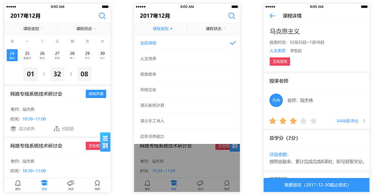 该中心提供了第二课堂课程类项目的选课中心,学生可通过手机APP,进行选课(系统可自动进行与第一课堂时间冲突检测)、考勤及评价等,系统可依据学生的参与情况自动计算学生的第