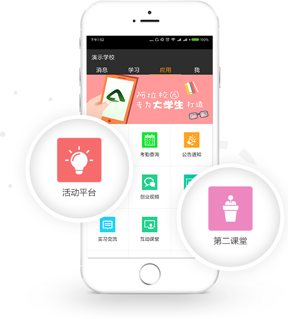 该中心提供了第二课堂校园活动的发布平台,学生可通过手机APP,进行活动报名、签到及评价等,系统可依据学生的活动参与情况自动计算学生的第二课堂认定成绩。